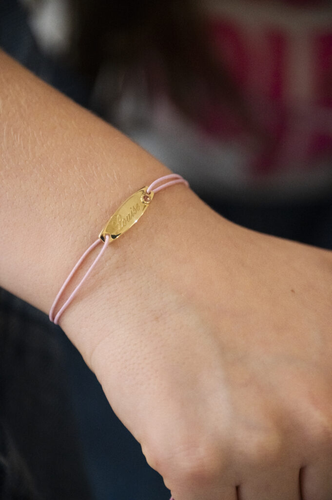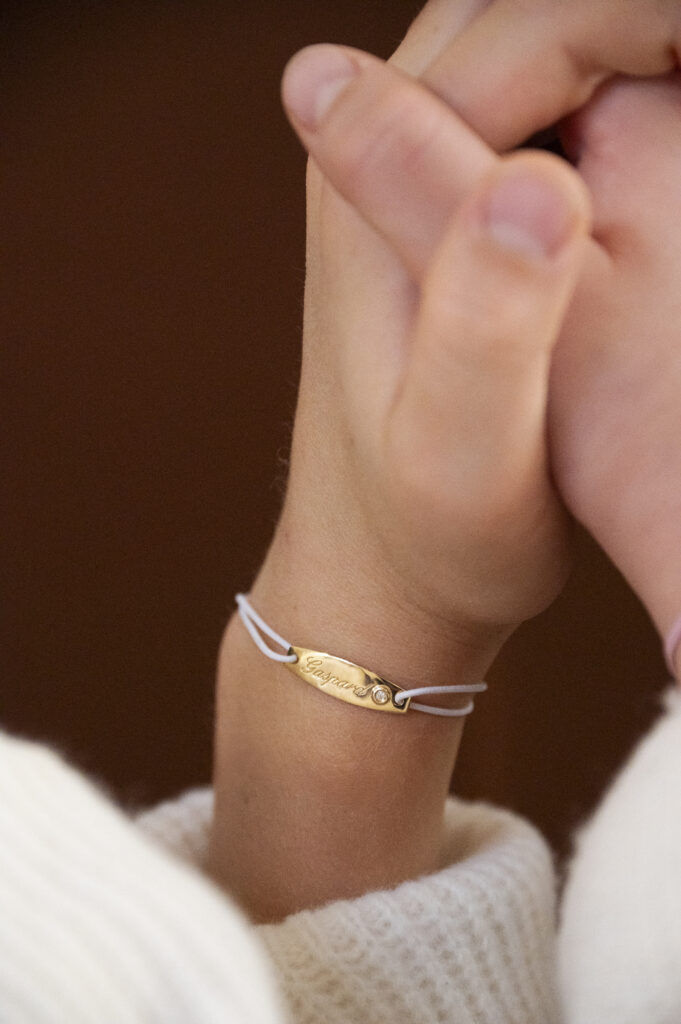 Mon Premier est une gourmette en or jaune 18 cts, montée sur un cordon, pensée pour accompagner les tout-petits dès leurs premiers instants.
