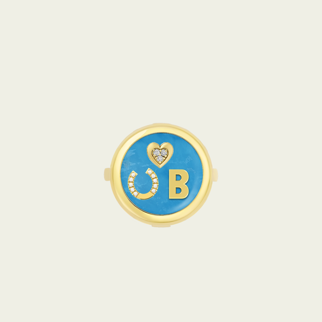 Bague médaillon or jaune 18 cts initiale & fer à cheval