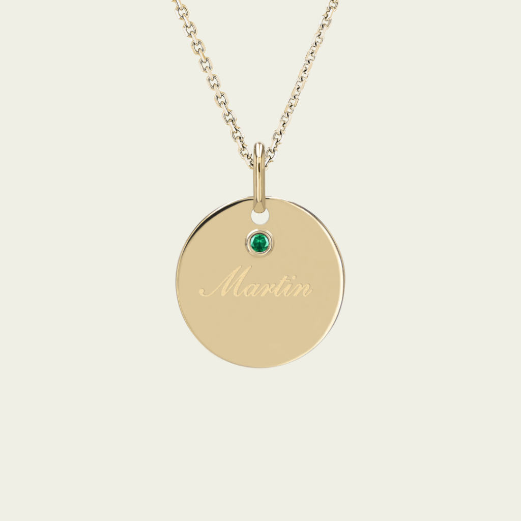 Médaille jeton en or jaune recyclé 18 carats sertie d'une émeraude (mois de mai).Gravure incluse.Finition poli-brillant.Vendu avec chaîne forçat limée 1,2 mm or jaune 18 carats avec pastille logo Loujem.