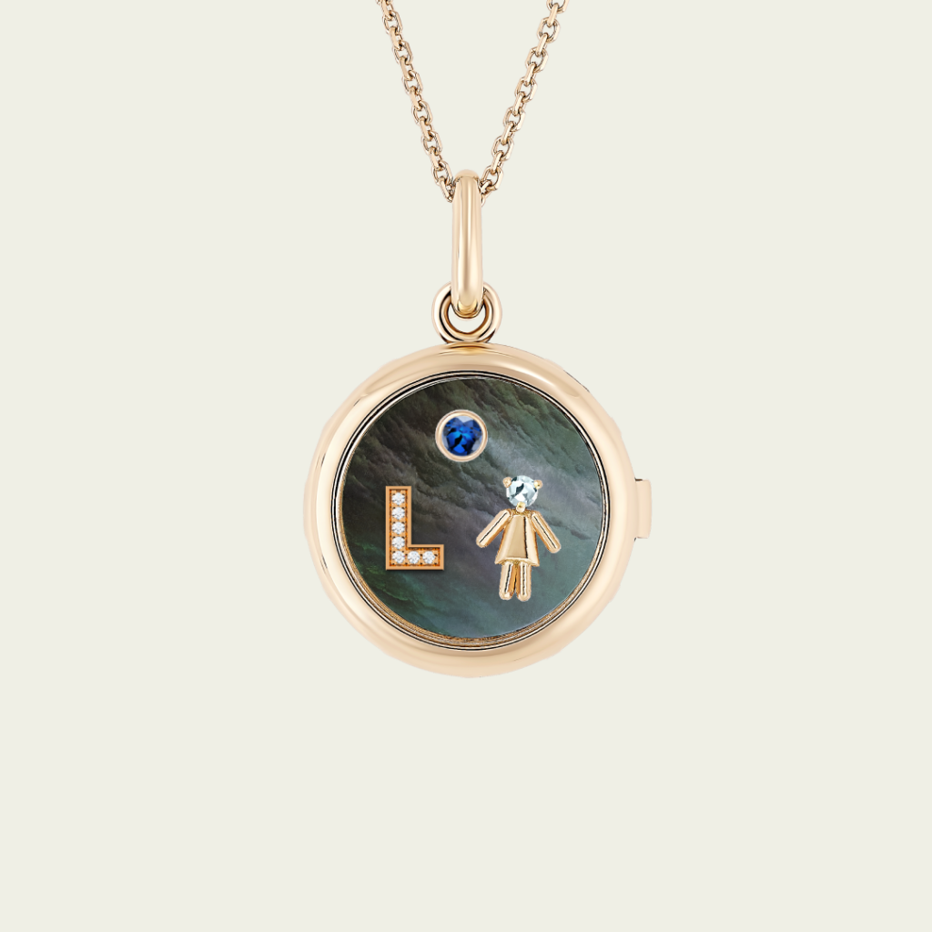 Médaillon initiale, fille aigue-marine & pierre naissance saphir